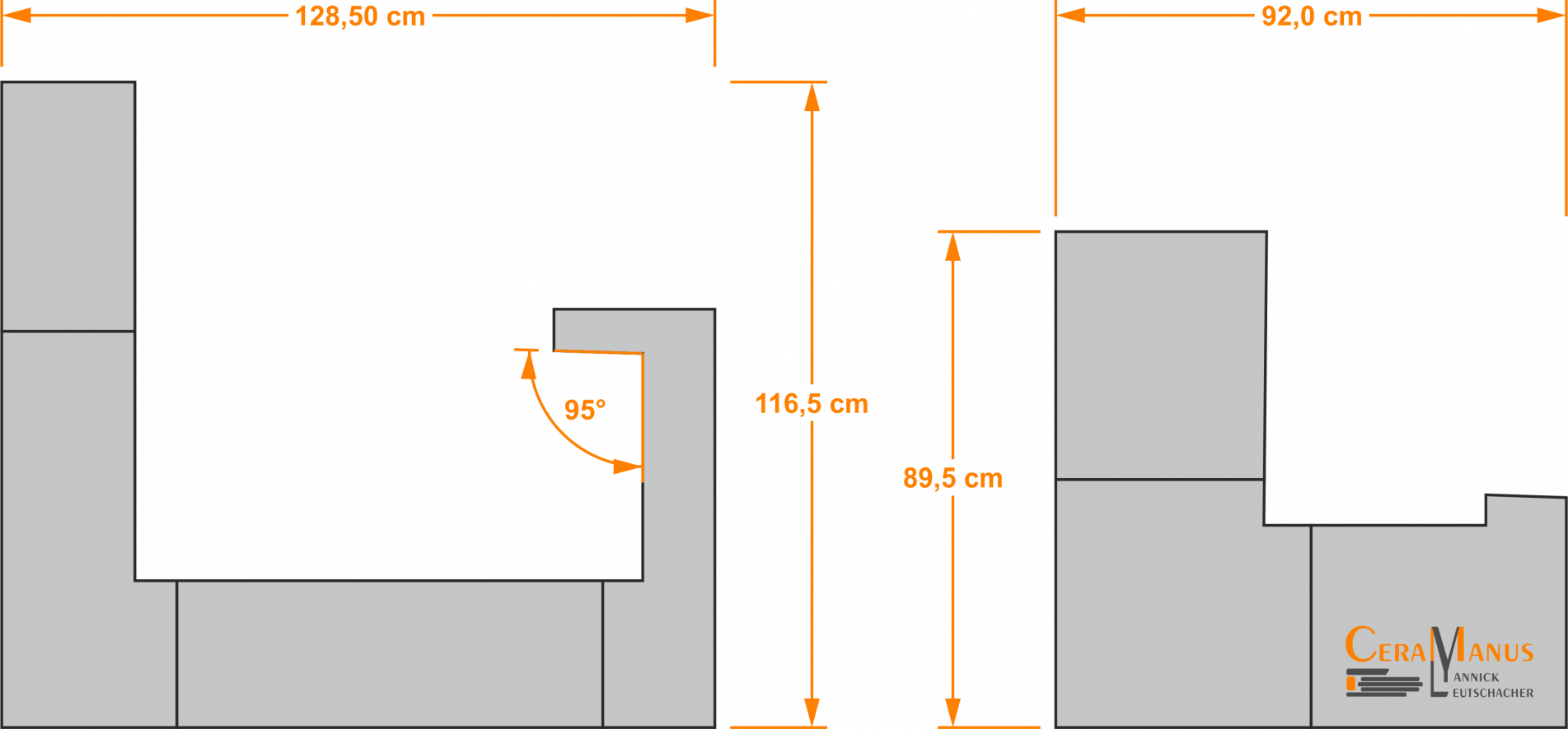 Das Bild oben zeigt die fertigen Abdeckplatten eines Kachelofens vor dem Versand in unserer Keramikwerkstatt. Das Bild unterhalb zeigt die Skizze: Maßgenau angefertigt - inklusive unterschiedlicher Winkel und Längen.