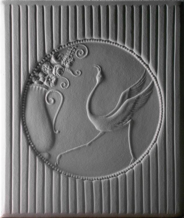 Der Jugendstil prägte Architektur- und Baukeramik von ca. 1900 bis 1920. Der Aufbruch in die Moderne brachte einen Willen zur Veränderung, weg von Nachahmung und Antike, hin zu einem eigenständigen Stil. Diese Epoche ist durch florale Dekore und Motive in Verbindung mit filigranen Tiermotiven geprägt, wie zum Beispiel auf unserer Kranich-Kachel im Jugendstil zu sehen ist: Ein stilisierter Vogel neben einer Blumenvase.
