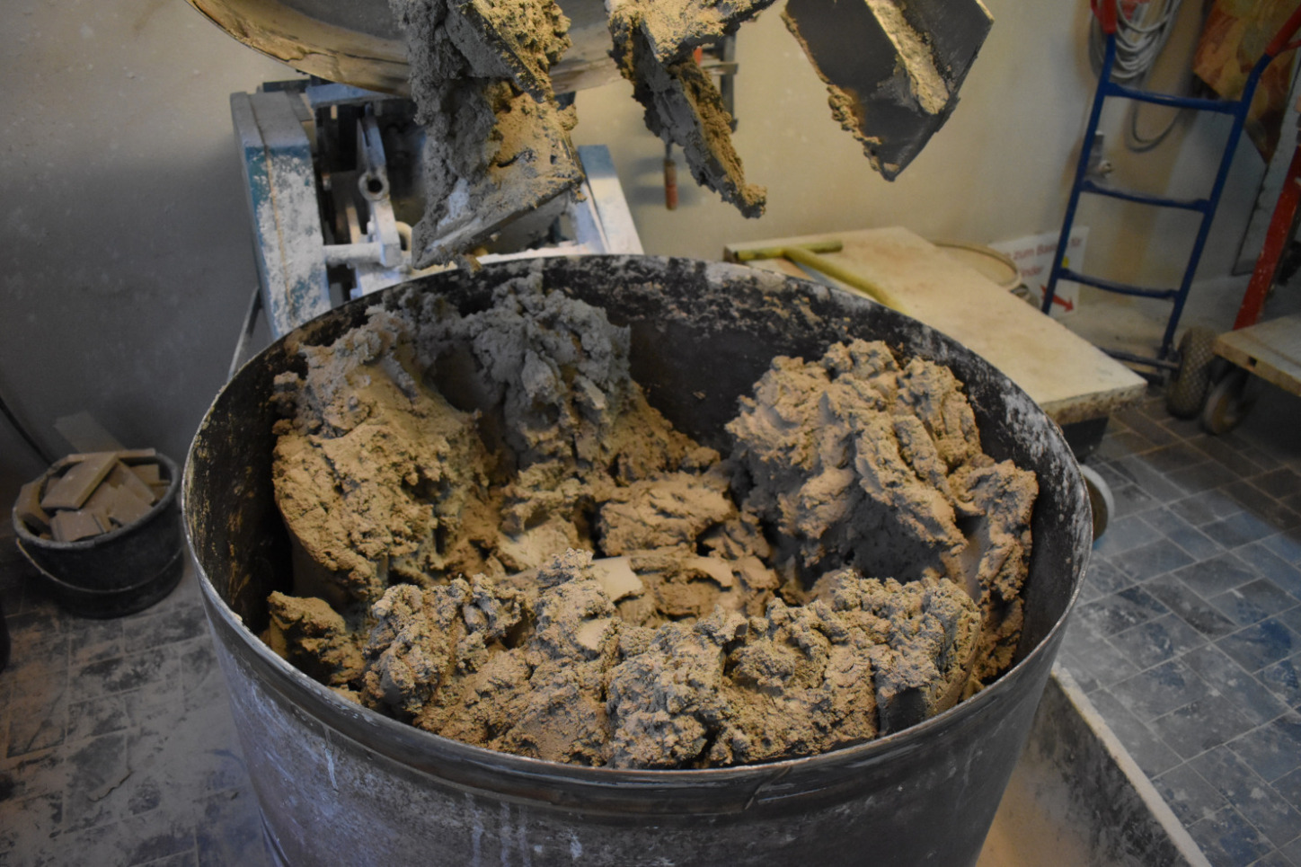 Hierfür mischen wir verschiedene Tonsorten und natürliche Zusätze (zum Beispiel Schamotte) mit Wasser, sodass wir die Masse auch immer noch weiter an spezielle Anforderungen angleichen können. So garantieren wir ein qualitativ hochwertiges Endprodukt.